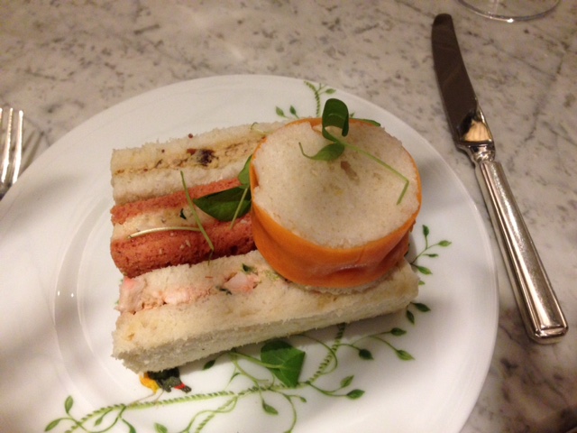 In previous posts, I’ve mentioned that, for me, the sandwiches and scones from the essential elements of afternoon tea: I can take or leave the pastries and sticky cakes. Well, someone at the Kimpton Fitzroy must have been listening, because the sandwiches we ate today were possibly the finest I’ve ever eaten. First, though, came a delectable appetiser: Potato, Truffle & Quail Egg with Melba Toast, a sumptuous pot of lingering flavours and textures (especially when the egg yolk began oozing into the truffle: mmm).