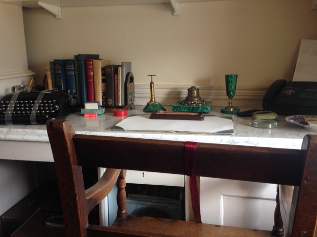 It was a wrench to tear myself away, but eventually I wandered through the Winter Dining Room, noting Agatha’s DBE (hidden, when she was alive, at the back of a cupboard), into the kitchen. In any house I visit, I’m always interested to see the kitchen; I think it tells you so much about its residents. Greenway’s is well-lit and airy and its Aga is used to this day for special occasions. The cage belonging to Rosalind and Anthony’s parrot resides on the window sill – and the cookery books containing Agatha Christie’s favourite recipes retain pride of place.