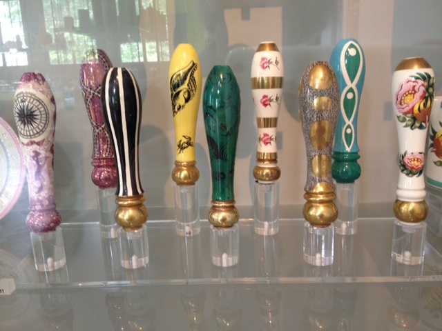 Demonstrating a keen sense of fun, she produced beer pull handles, pottery whisky barrels and door furniture in a wide variety of patterns: below are beer pull handles in various patterns dating back to 1955-60.